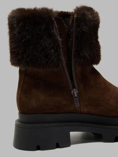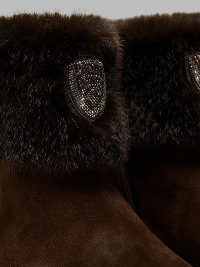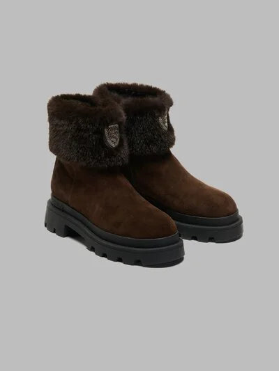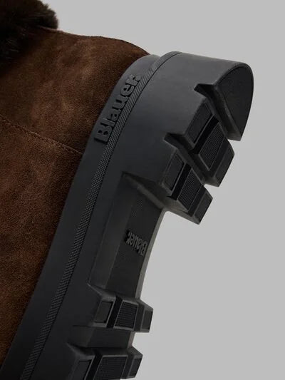 Botín de Blauer de mujer en piel ante, con una suela tipo militar robusta y gruesa. El toque distintivo es el dobladillo en material efecto piel que envuelve la parte superior del tobillo, embellecido con el icónico escudo Blauer frontal brillante. Interior con forro en material efecto piel y plantilla extraíble en piel. Este botín combina comodidad y estilo, ideal para un look invernal!
