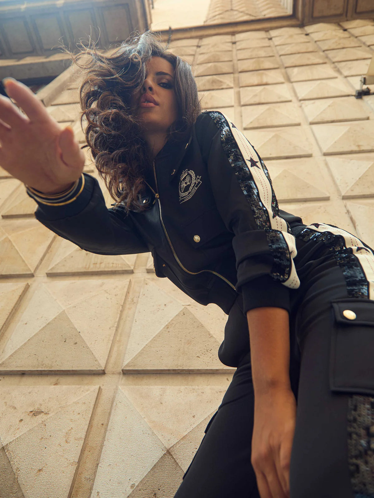 Chaqueta negra, estilo bomber, con bolsillos en el pecho y franja en el lateral de la manga en dorado con estrellas. Se cierra con cremallera en el centro