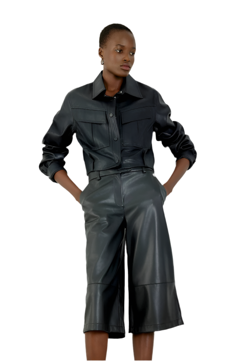 Chaqueta de aspecto de cuero corto, cierre de botón frontal, bolsillos delanteros, con cuello, mangas largas, corte regular.