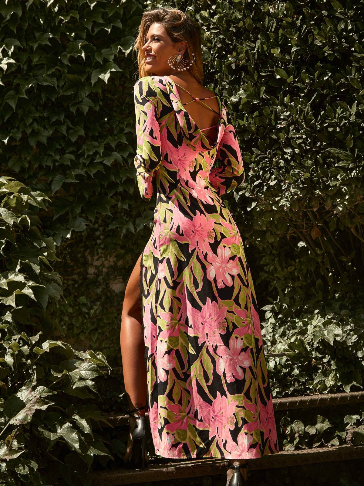 Vestido largo de CAMALEÓNICA modelo FALKOR , de manga larga, con estampado de flores en fucsia y verde y fondo negro.
