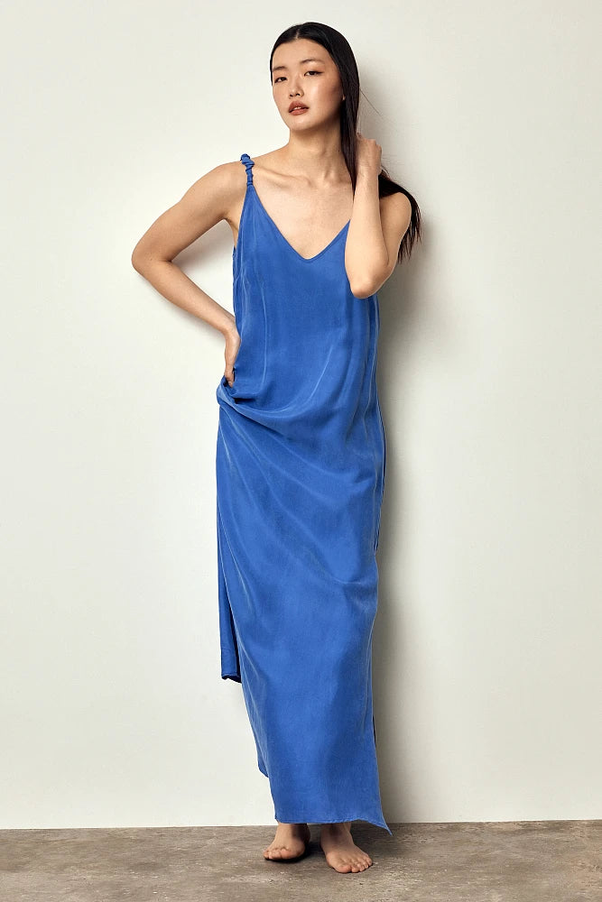 Vestido maxi, espalda abierta, tejido elástico, sin mangas, diseño fruncido, escote pico, diseño recto